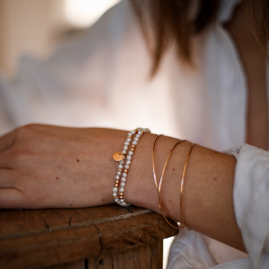 Bracelet en perles d’eau douce, médaille et fleurs – plaqué or