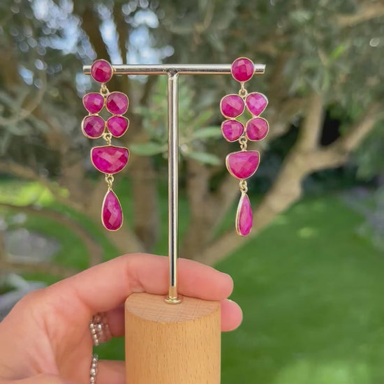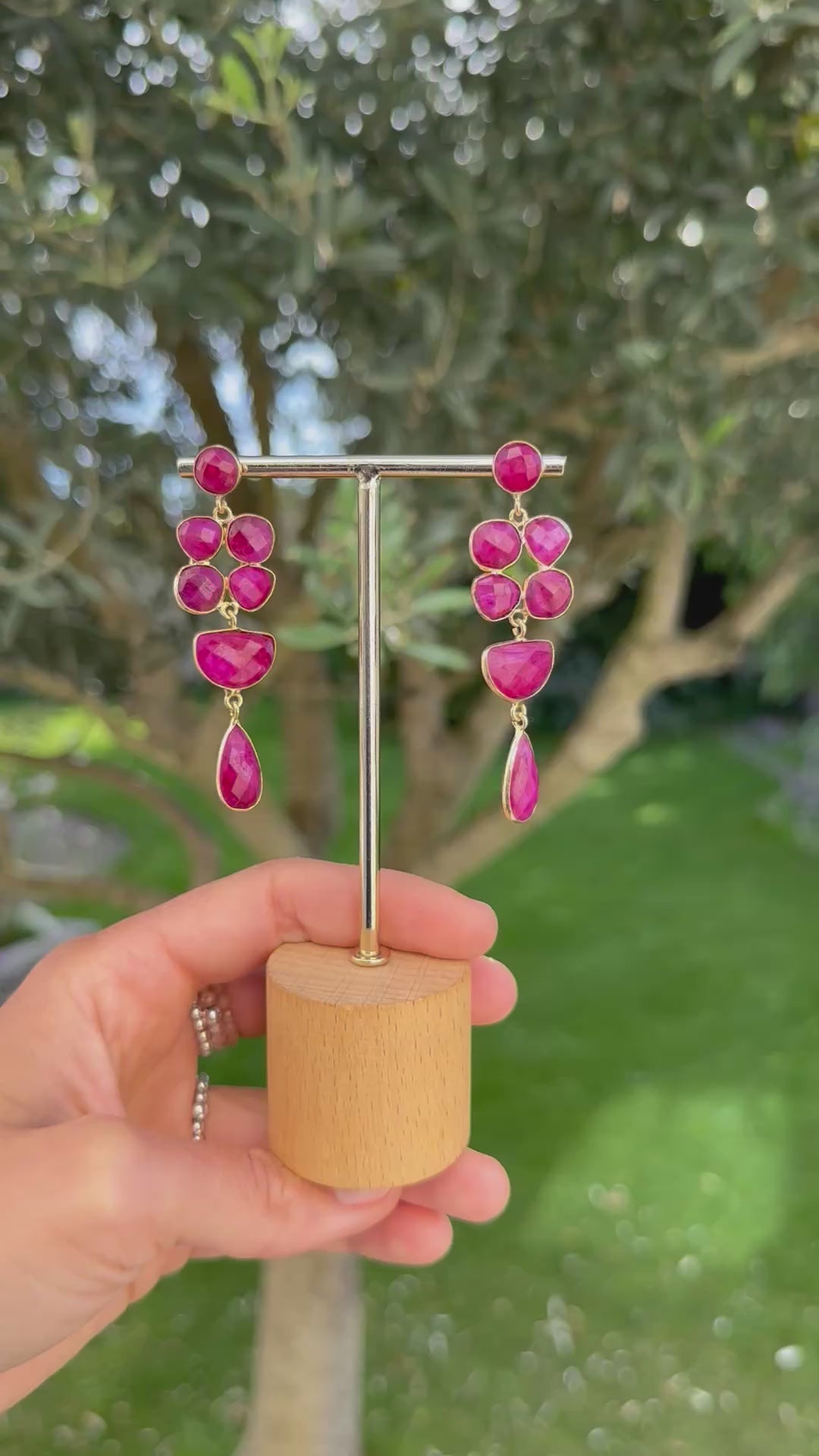 Ces boucles d’oreilles longues associent la finesse de l'or fin au rose fuschsia.