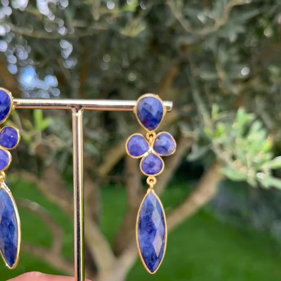 Ces boucles d’oreilles longues associent la finesse du doré à l’or fin au bleu de la lapis lazuli.